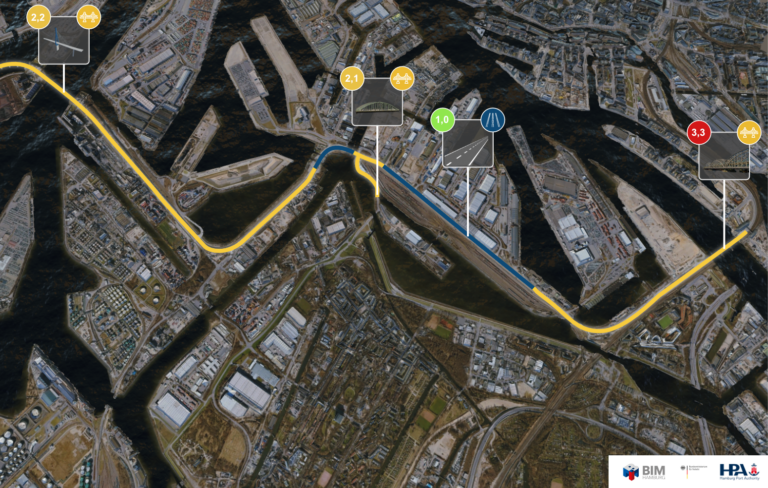 Um das Erhaltungsmanagement von Infrastrukturbauwerken zu innovieren und zukunftsfähig aufzustellen, haben das Bundesministerium für Verkehr und BIM.Hamburg gemeinsam mit der Hamburg Port Authority ein wegweisendes Projekt gestartet: den Digitalen Zwilling Haupthafenroute.