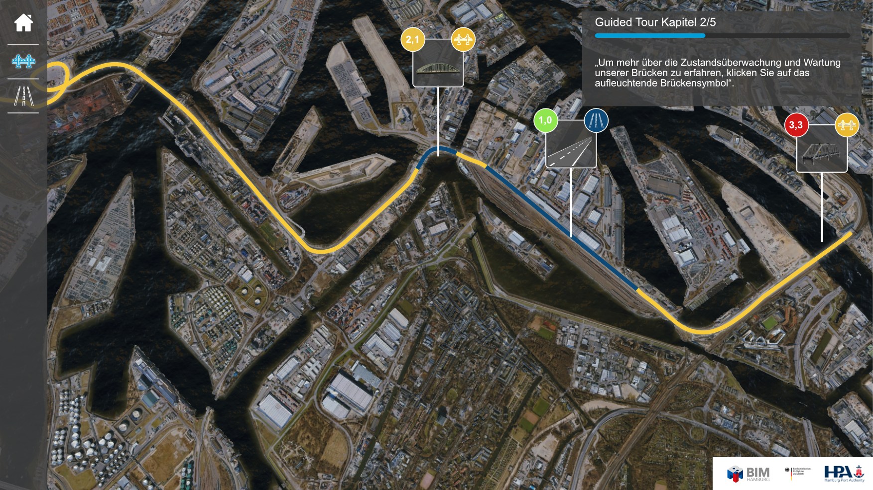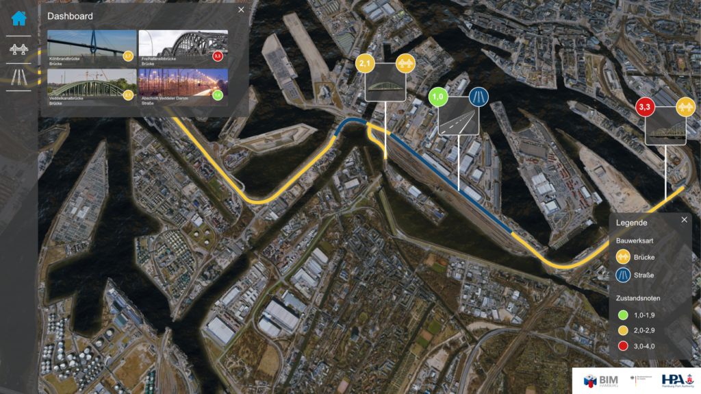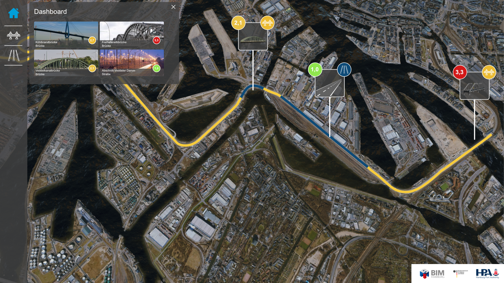 Im Betrieb eines Streckenabschnitts oder eines gesamten Hafenareals beeinflussen sich Bauwerke gegenseitig. Eine Sperrung einer Straße oder Brücke führt zu Umleitungen, die andere Abschnitte stärker belasten. Der Systemzwilling erhöht das Bewusstsein für solche systemischen Zusammenhänge und unterstützt Nutzer:innen dabei, Wechselwirkungen zwischen Bauwerken besser zu verstehen.