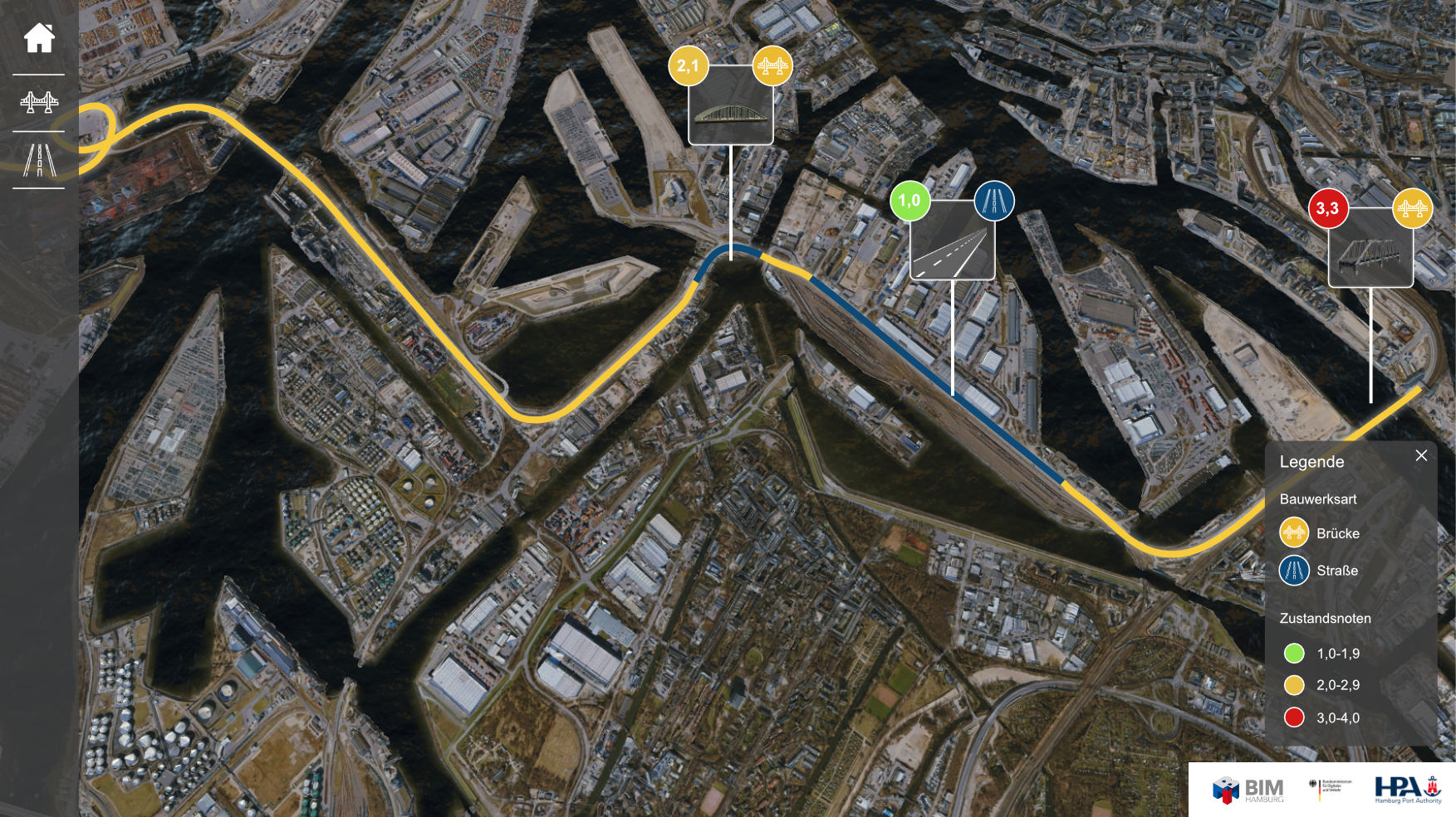 Zusätzlich zu den übergeordneten Informationen zu den Objektzwillingen zeigt der Systemzwilling auf Netzebene Informationen zum Zustand des Straßennetzes im Hamburger Hafen. In unterschiedlichen Ansichten lassen sich die führenden Zustandsnoten der Straßen (ZEB-Daten), die Restnutzungsdauer der Straßen und die an den Straßen durchgeführten Projekte und Maßnahmen anzeigen.