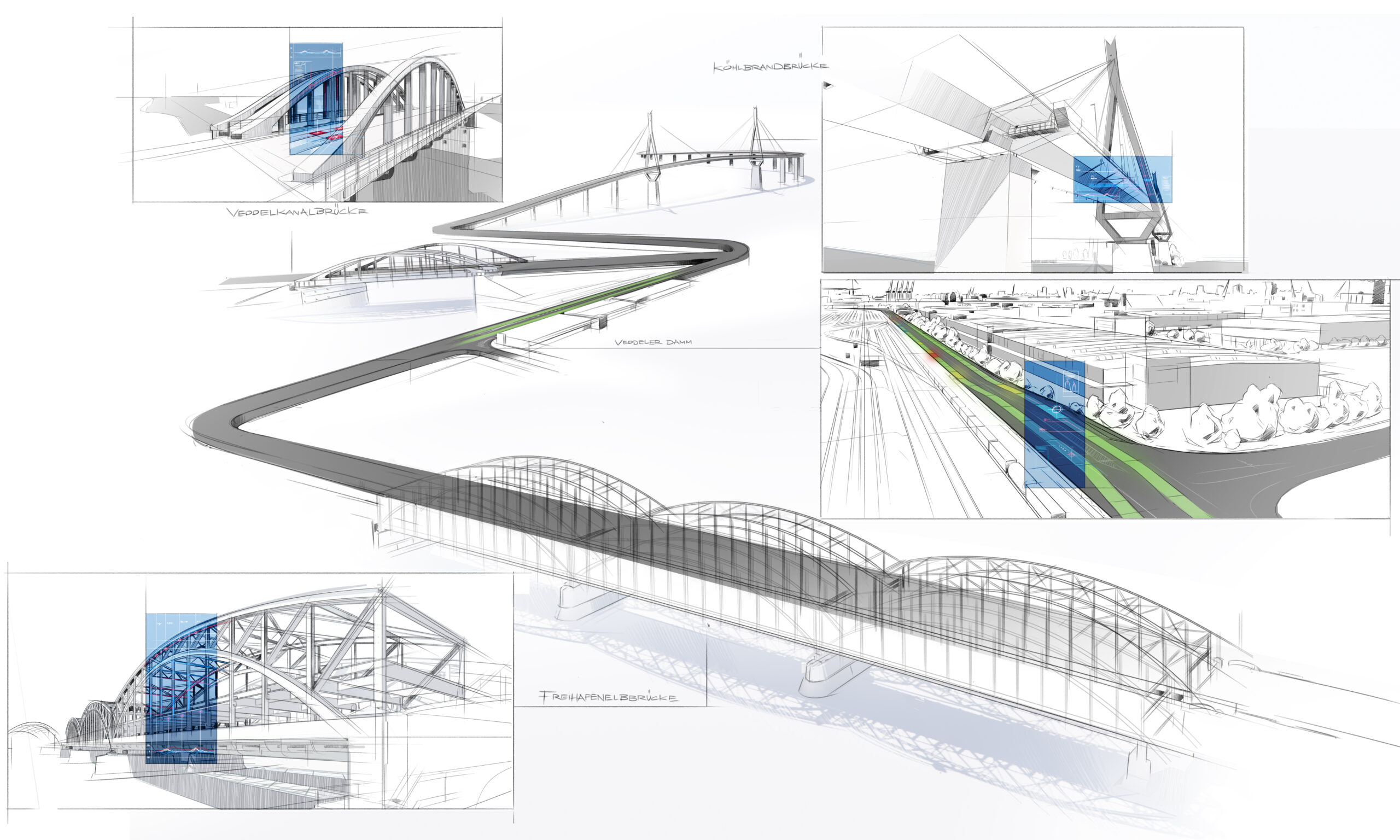 Der Digitale Systemzwilling bildet die gesamte Hamburger Haupthafenroute ab. Er fasst die Informationen aus den Objektzwillingen auf übergeordneter Ebene zusammen und bringt sie in einen Kontext. Zu den Objektzwillingen zählen die Köhlbrandbrücke, die Freihafenelbbrücke, abzweigend die Veddelkanalbrücke sowie der Straßenabschnitt Veddeler Damm. Der Systemzwilling ermöglicht einen ganzheitlichen Überblick über diese Bauwerke und deren digitale Abbilder. Außerdem bildet der Systemzwilling Informationen zum Zustand des Straßennetzes im Hamburger Hafen ab.